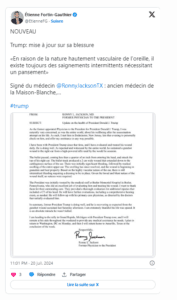 Trump doit garder son pansement à l’oreille droite. «En raison de la nature hautement vasculaire de l'oreille, il existe toujours des saignements intermittents nécessitant un pansement», a écrit le Dr Ronny Jackon dans une lettre rendue publique sur les réseaux sociaux.