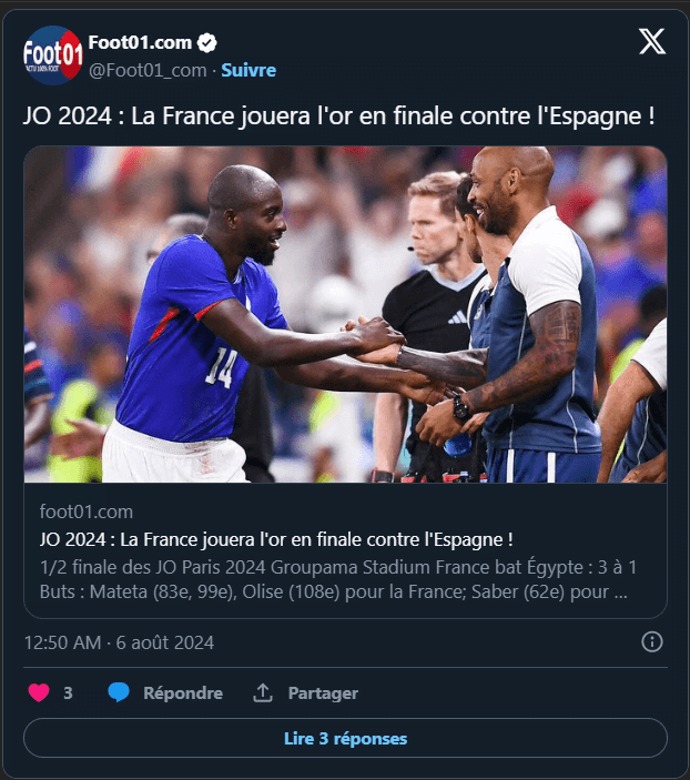 Il n’en fallait pas plus pour que certains l’imaginent en lieu et place de Didier Deschamps dans les mois à venir. C’est notamment le cas du journaliste Emmanuel Merceron, qui a exprimé son désir sur X de voir Thierry Henry chez les Bleus. « Médaille pour les Bleus du foot ! Thierry Henry a réussi son pari. Ce sera très difficile contre les espagnols mais son tournoi est réussi. Avec cette équipe qui a essuyé plus de 20 refus… Il se pose en candidat pour l’après DD en 2026. Ne riez pas trop fort, c’est une vraie et bonne option » a publié le journaliste sur son compte X. Et lorsque les internautes lui rappellent qu’un certain Zinedine Zidane est en salle d’attente depuis de longues années, le journaliste n’est pas totalement convaincu. « Ca commence à faire long sans coacher d’ici 2026. S’il n’a pas entraîné pendant 6 ans, bof » a publié Emmanuel Merceron, qui fait donc de Thierry Henry le favori n°1 pour succéder à Didier Deschamps après le Mondial 2026 aux Etats-Unis.