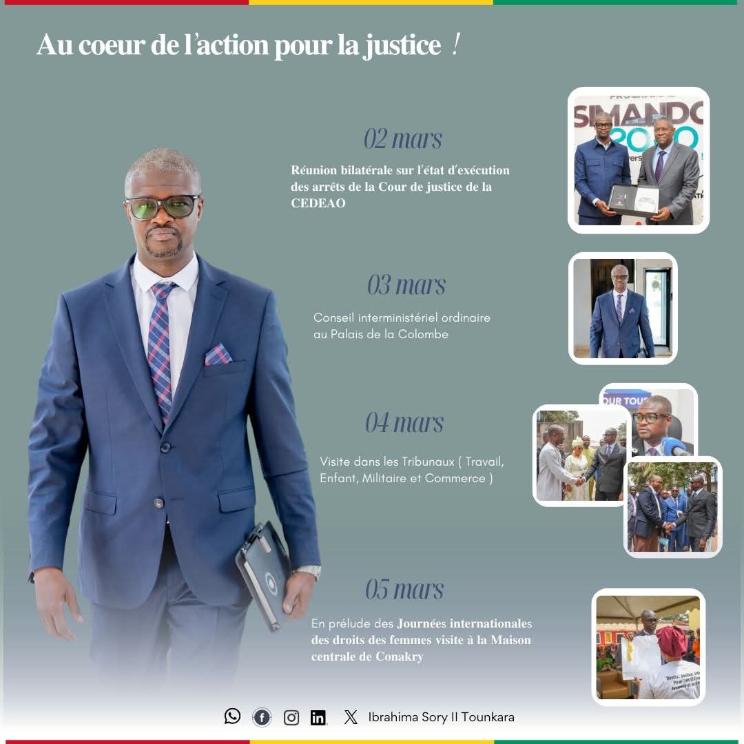 Dans le cadre des efforts engagés pour moderniser et consolider le système judiciaire guinéen, le ministre de la Justice et des Droits de l’Homme, Ibrahima Sory II Tounkara, a mené du 2 au 5 mars une série d’activités institutionnelles visant à renforcer l’efficacité de la justice et à améliorer son accessibilité pour les citoyens.