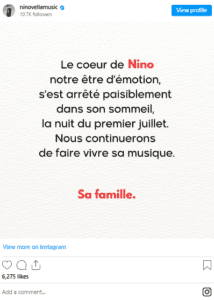 Au vu du nombre de réactions suite au drame, c'est sur les réseaux sociaux que les proches de Nino Vella ont tenu à adresser un mot à sa communauté. Par le biais du compte Instagram du musicien, ils ont déclaré : "Le cœur de Nino, notre être d'émotion, s'est arrêté paisiblement dans son sommeil, la nuit du premier juillet. Nous continuerons de faire vivre sa musique". Une publication signée par "Sa famille" qui a, une fois de plus, ému tous ceux qui le suivaient au quotidien.