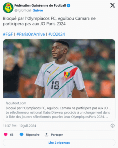 “Le milieu de terrain de l’Olympiacos FC n’ira finalement pas aux JO de Paris 2024. Dans un courriel envoyé à la Fédération Guinéenne de Football, le club grec a fait savoir qu’il ne libère pas l’ancien joueur des Éléphants de Coléah“, a annoncé ce mercredi soir la Fédération guinéenne de football (Feguifoot). A seulement 23 ans, l'ex-Lillois compte 31 capes en A (pour 6 buts), où il possède un statut de titulaire. Il était clairement l'un des leaders attendus de ce groupe avec Naby Keita, Abdoulaye Touré, Amadou Diawara ou encore Ilaix Moriba, qui eux seront bien là.