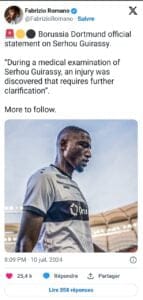 En effet, le joueur de 28 ans échoué à la visite médicale traditionnelle, préalable à la signature de son bail. “Au cours d'un examen médical de Serhou Guirassy, une blessure a été constatée, qui nécessite un examen plus approfondi“, a annoncé le club Jaune et Noir dans un communiqué laconique via son compte officiel X mercredi.