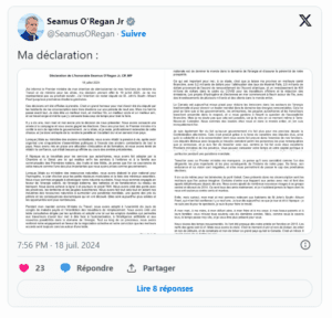 M. O'Regan a ajouté être «profondément redevable» envers Justin Trudeau pour la confiance qu'il a placée en lui et que travailler avec lui lui manquerait. «Je pense qu'il sera considéré comme l'un des dirigeants les plus importants et les plus conséquents de l'histoire de notre pays», a-t-il écrit.