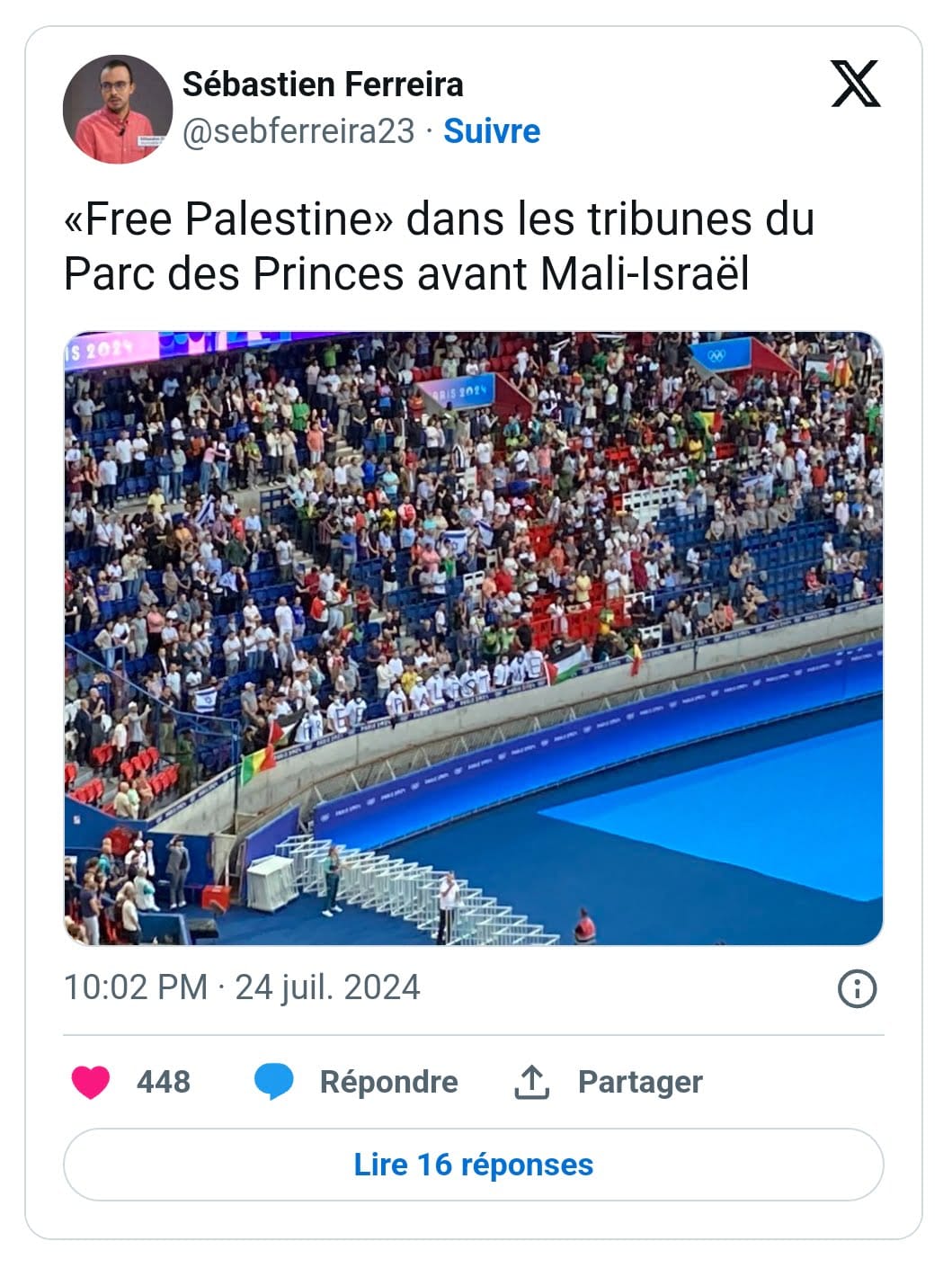 L’hymne de l’équipe d’Israël de football a été sifflé avant son match contre le Mali au Parc des Princes. Un message appelant à la liberté pour la Palestine a été aperçu en tribunes au même moment.