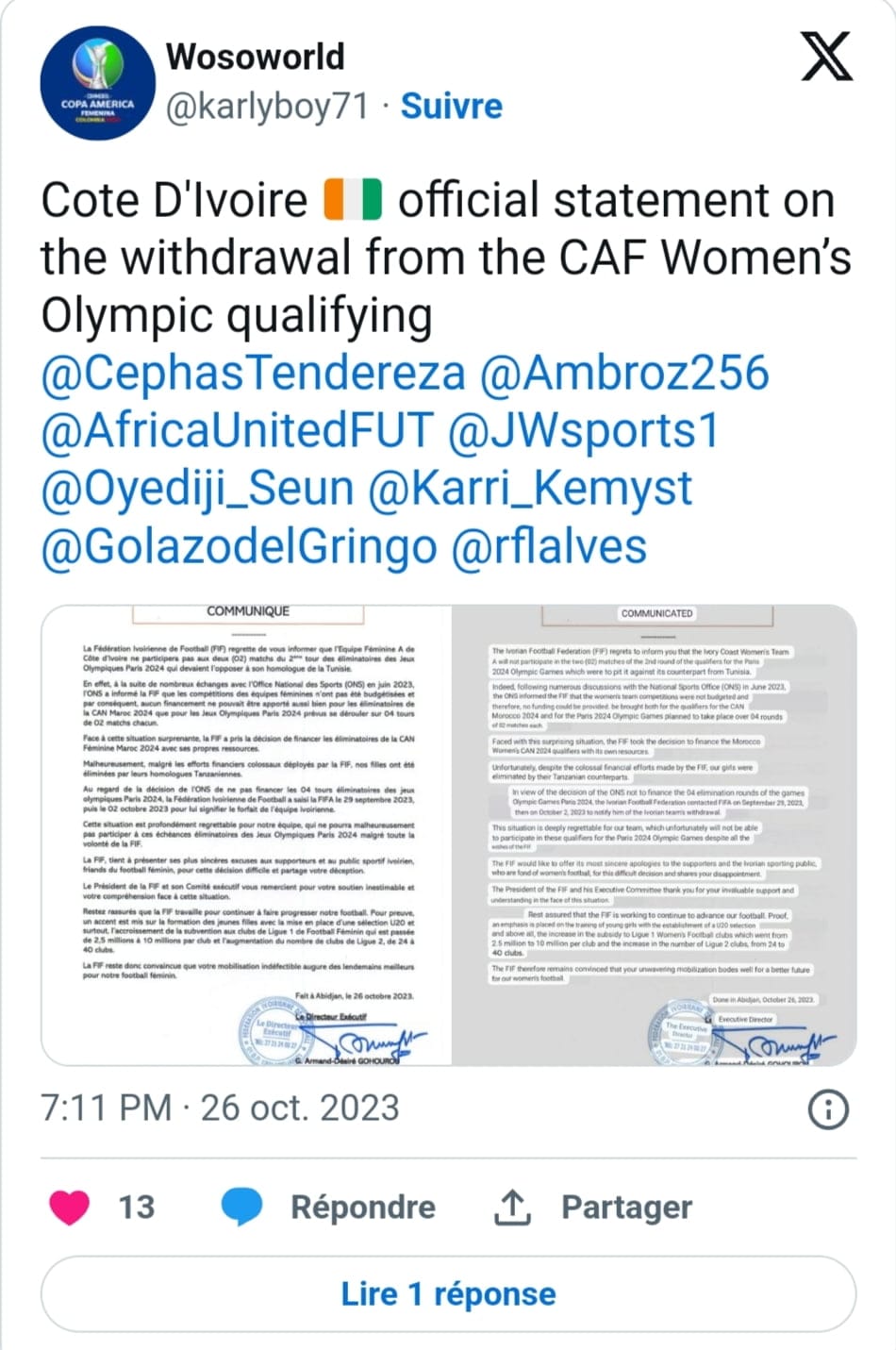 Éliminée au 2e tour des qualifications pour les JO, la sélection féminine ivoirienne n'était pas si loin de décrocher son ticket pour Paris. Encore aurait-il fallu disputer cette rencontre face à la Tunisie… Dans un communiqué datant d'octobre dernier, la Fédération ivoirienne de Football (FIF) avait justifié ce forfait par le fait que les compétitions des équipes féminines n'avaient pas été budgétisées par l'Office National des Sports (ONS). En conséquence, aucun financement ne pouvait être apporté pour les éliminatoires de la CAN 2024 et des JO. La FIF avait donc pris la décision de financer les éliminatoires de la CAN avec ses propres ressources, mais sans avoir les moyens de le faire pour les JO. Après avoir décroché la qualification sans jouer suite au forfait de la Sierra Leone au premier tour, l'équipe a donc été éliminée sur tapis vert au second tour.