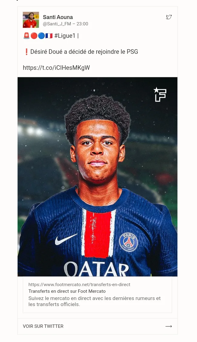 Si la presse allemande avançait récemment que le Bayern Munich disposait d’une longueur d’avance dans ce dossier dans la mesure où il était parvenu à s’attirer les faveurs du Français, nous sommes en mesure de vous confirmer que Désiré Doué a finalement choisi de rejoindre le Paris Saint-Germain, visiblement séduit par le discours des dirigeants franciliens et de Luis Enrique. Une excellente nouvelle pour le club de la capitale qui en avait fait sa priorité après le recrutement du milieu défensif de Benfica, Joao Neves. Le champion de France en titre doit désormais finaliser son arrivée.
