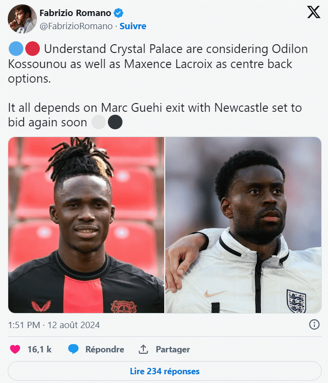 Selon les informations de Fabrizio Romano, le natif d’Abidjan fait partie des options de Crystal Palace pour pallier le départ plus que probable de Marc Guehi. Le spécialiste mercato précise cependant que sa potentielle arrivée est conditionnée au transfert de l’Anglais pour lequel une prochaine offre de Newcastle est dans les tuyaux.