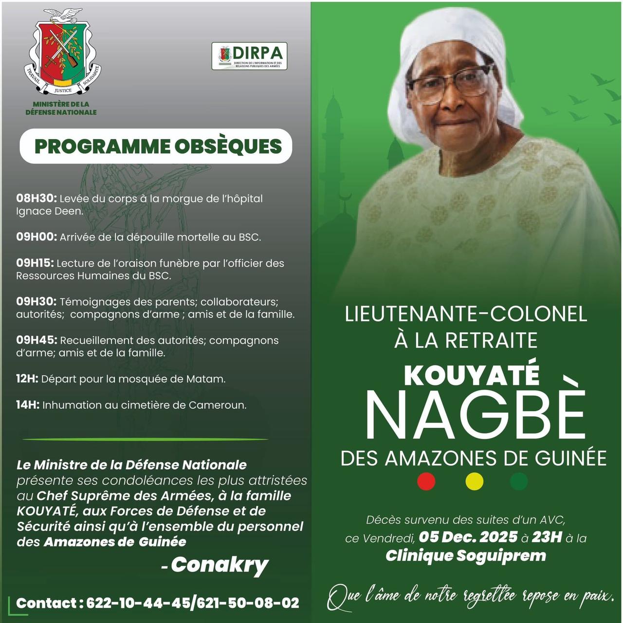 Les Amazones de Guinée, le premier orchestre féminin d'Afrique, sont en deuil. L'une de ses membres fondatrices, la lieutenante colonel à la retraite Nagbè Kouyaté, est décédée et sera inhumée ce mardi 9 décembre 2025 à Conakry. Cette nouvelle a plongé la communauté guinéenne dans la tristesse
