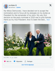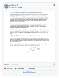 e président Joe Biden a mis fin à sa campagne de réélection dimanche après que après que ses collègues démocrates aient perdu confiance en son acuité mentale et en sa capacité à battre Donald Trump. Il a annoncé sa décision dans une lettre publiée sur X.
