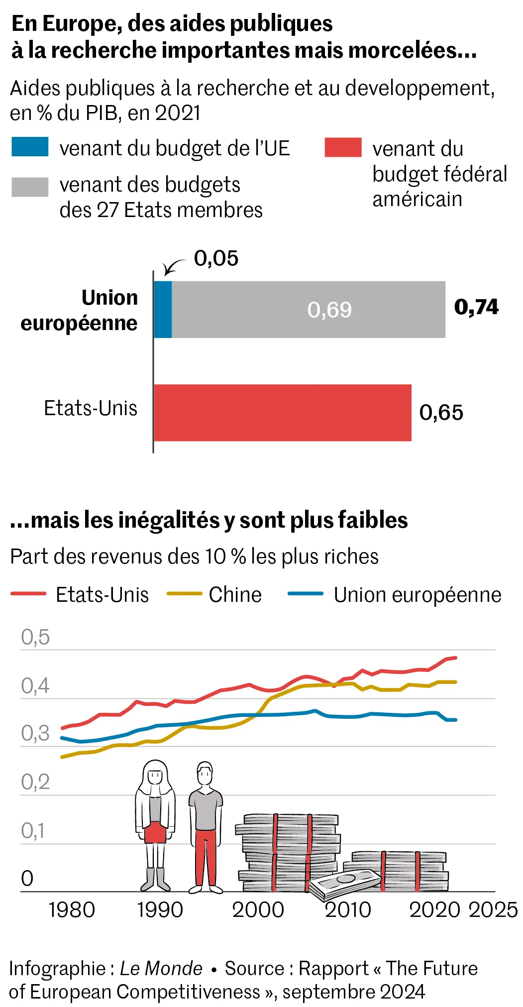 Tout au long de 400 pages, M. Draghi décortique, de manière aussi chirurgicale qu’implacable, les maux d’une économie en plein décrochage par rapport aux Etats-Unis et à la Chine. Si elle ne réagit pas en investissant massivement dans l’innovation, prédit l’économiste, l’UE est promise à une « lente agonie ». Face à la montée des populismes, qui se nourrissent de l’érosion du niveau de vie des populations, et au rejet croissant des politiques de verdissement de l’économie, M. Draghi assène : « Sans action, nous devrons compromettre soit notre niveau de vie, soit notre environnement, soit notre liberté. […] Nous devrons revoir à la baisse certaines, voire toutes nos ambitions. C’est un défi existentiel. »